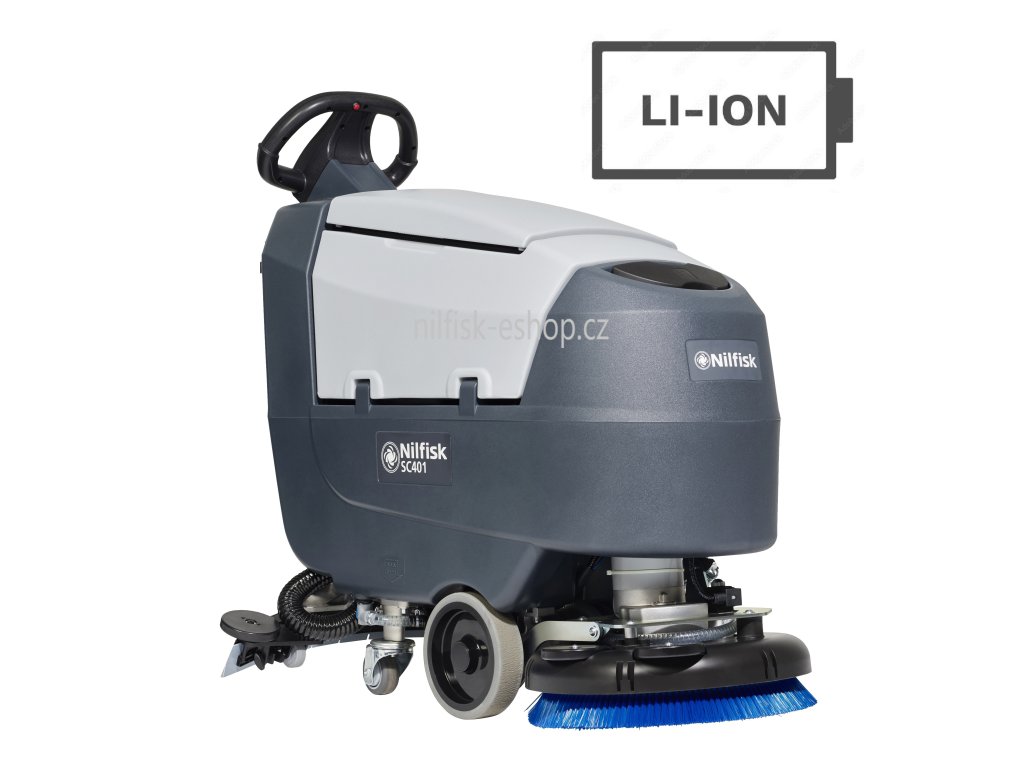 Nilfisk SC401 Li-ion pracuje s napětím 24 V a je vybaven moderní lithiovou baterií, která umožňuje nepřetržitý provoz až 3,4 hodiny na jedno nabití. Baterie se vyznačuje dlouhou životností, rychlým nabíjením a nulovou potřebou údržby.